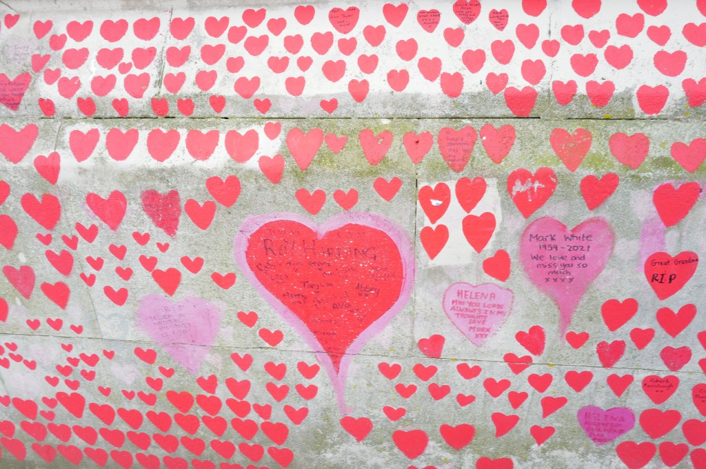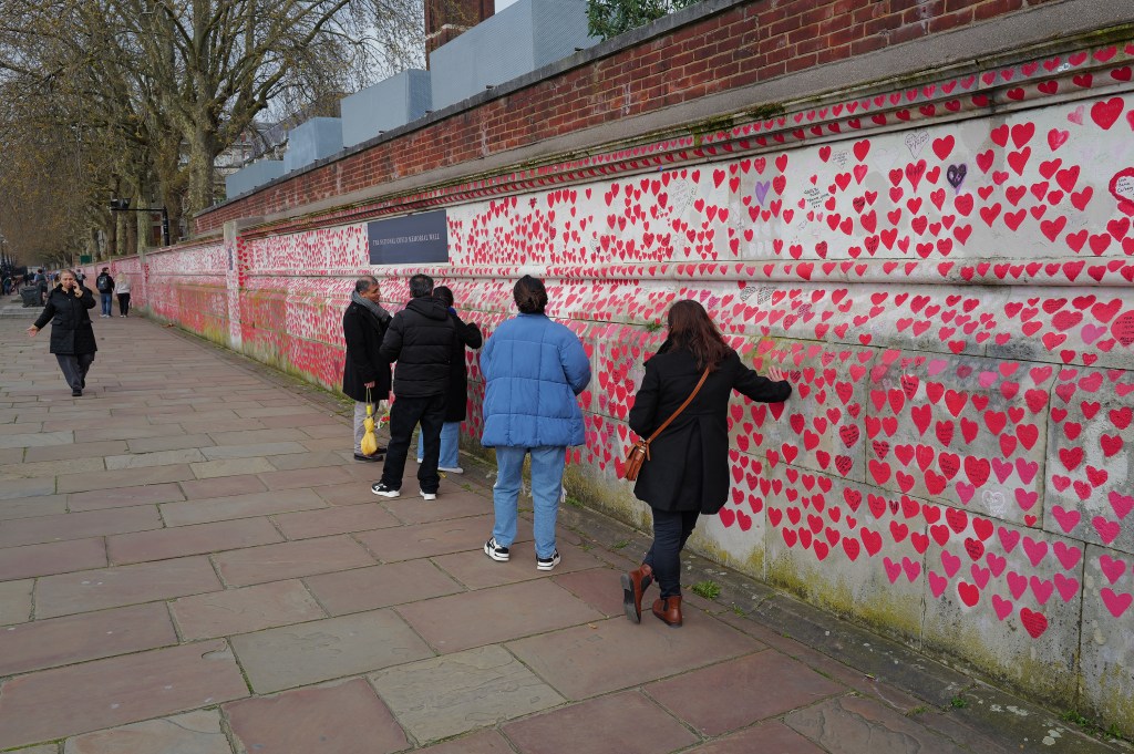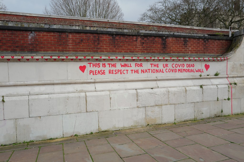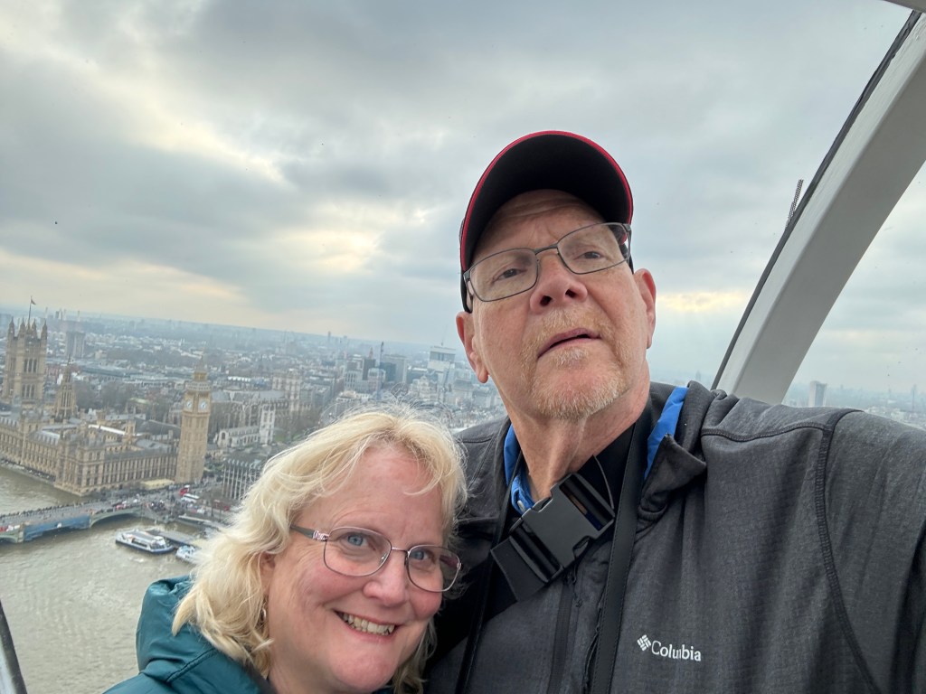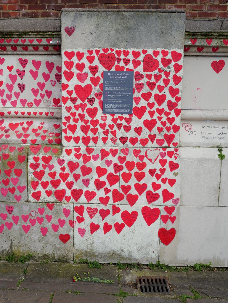 After our overnight flight from Atlanta to London, we spent our Easter exploring London. We walked from our hotel (Park Plaza Riverbank) to the London Eye along the Thames River. It was still a bit cloudy, but the sun would poke out occasionally lighting up our view of London. The Covid wall was moving and it was interesting to see how people reacted looking at the number of memorials left on the wall.